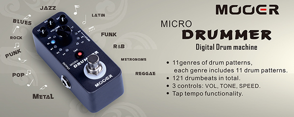 Micro drummer is a compact drum machine that slots right into your pedal chain. Sporting 121 drumbeats which span a wide variety of different musical styles and can be synced up to your desired time easily using the on boad tap tempo. Never miss a beat with MOOER micro DRUMMER!!!