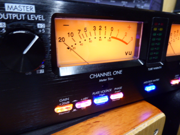 Large back-lit analog VU output meters display output levels while multi-colored LED arrays show tube gain.
