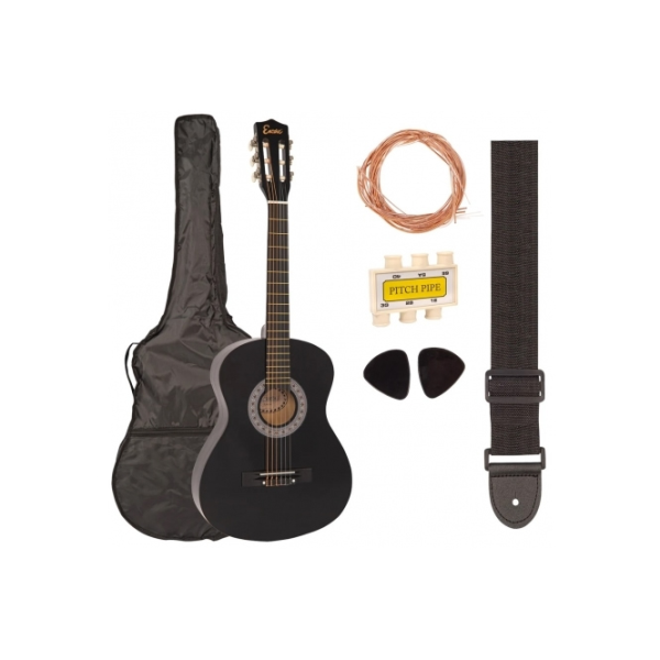 The Encore 3/4 Size Classical Guitar Pack is here presented in a Black finish, and comes with all the accessories needed to get started playing guitar. 3/4 size is perfect for slightly older children, with an overall body length of 94cm. Get in touch if in any doubt about the correct size to purchase.