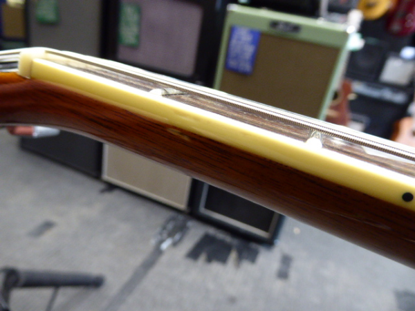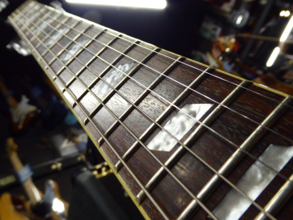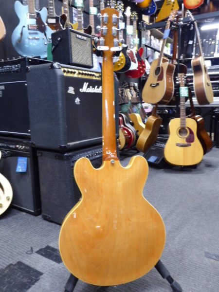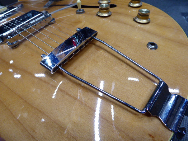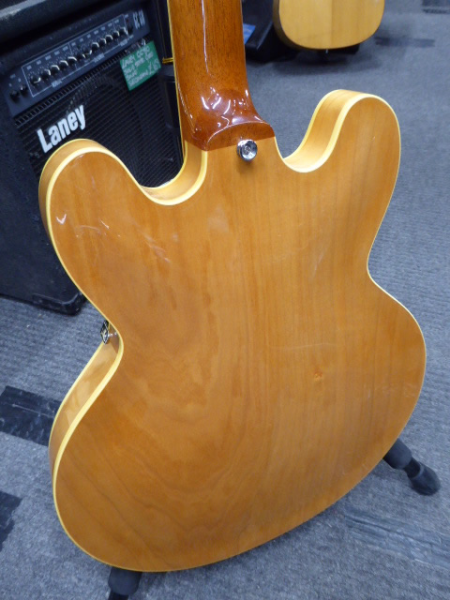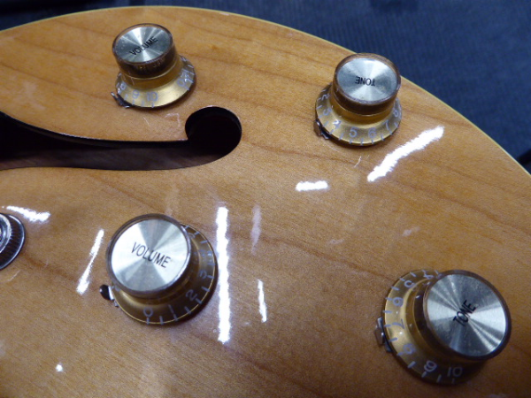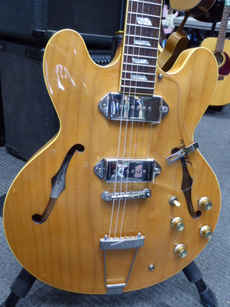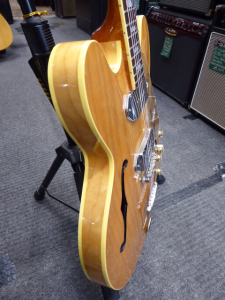 The Song bird with its P90s is very reminiscent of the tones of the Casino from the 60’s It is a 16-inch wide by 1 3/4 inch deep laminated flame maple hollow body double cutaway guitar with a mahogany neck with a tun-o-matic bridge and archtop tailpiece.