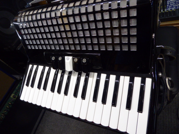 Lovely 72 bass accordion with 34 treble keys, three-voice tremolo tuning and five treble couplers.