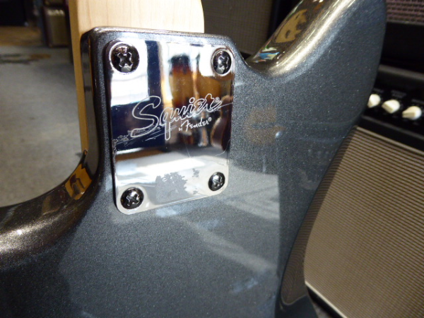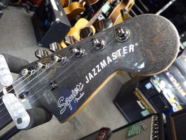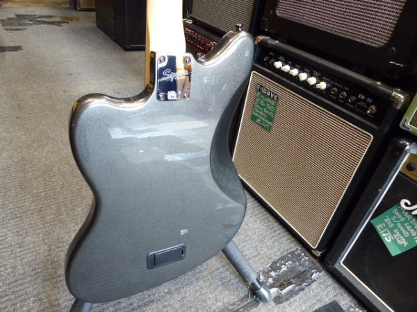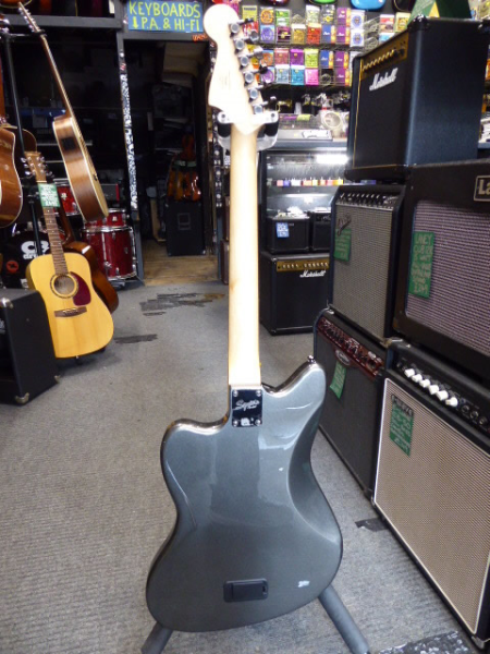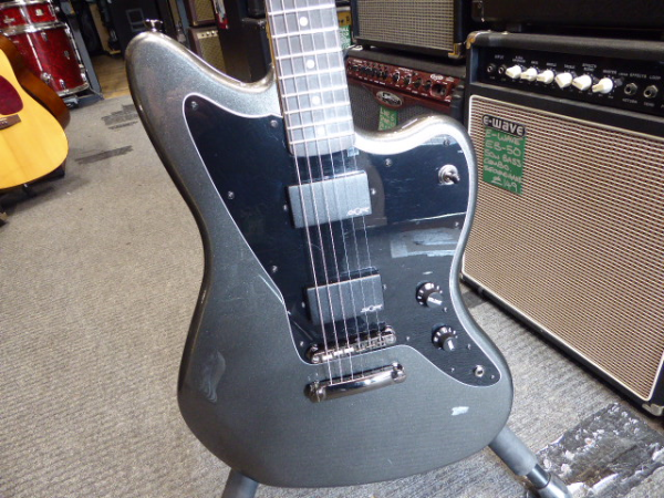 Discontinued Jazzmaster with active circuit, twin humbucking pickups, stoptail bridge, Graphite Metallic finish, and matching headstock.