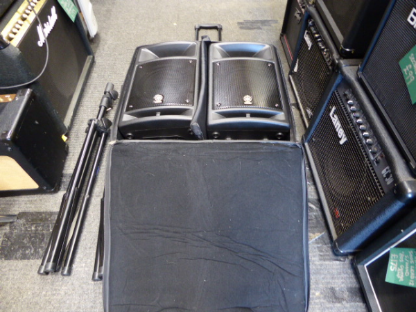 Portable, all-in-one 300-watt (150W + 150W) PA system featuring a detachable 8-channel powered mixer and two passive speakers.