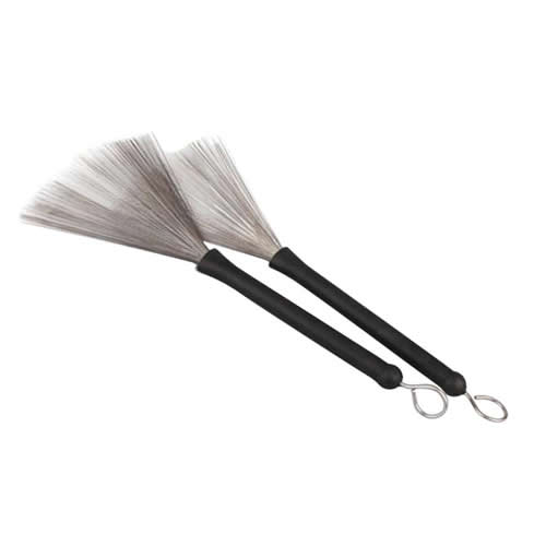 A pair of retractable stiff wire drum brushes with hard black plastic handles.
