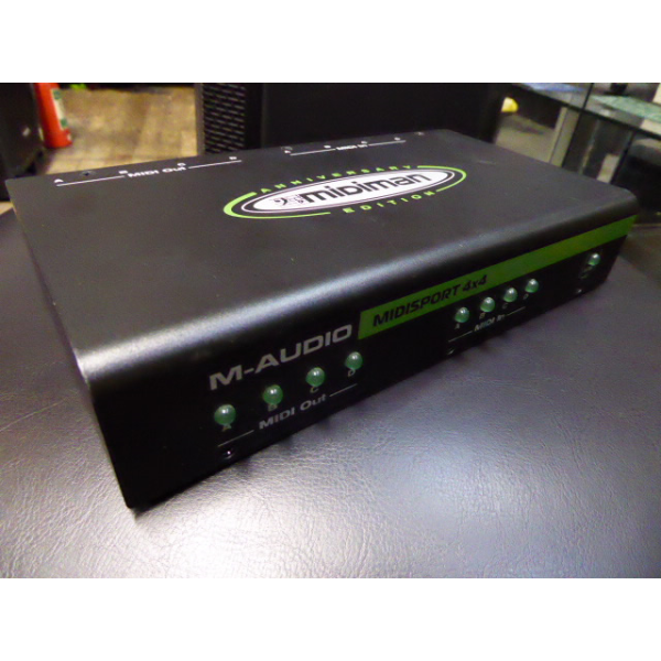 USB powered midi interface with 4 inputs and 4 outputs, offering 64 channels of midi I/O.