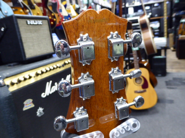 The Song bird with its P90s is very reminiscent of the tones of the Casino from the 60’s It is a 16-inch wide by 1 3/4 inch deep laminated flame maple hollow body double cutaway guitar with a mahogany neck with a tun-o-matic bridge and archtop tailpiece.