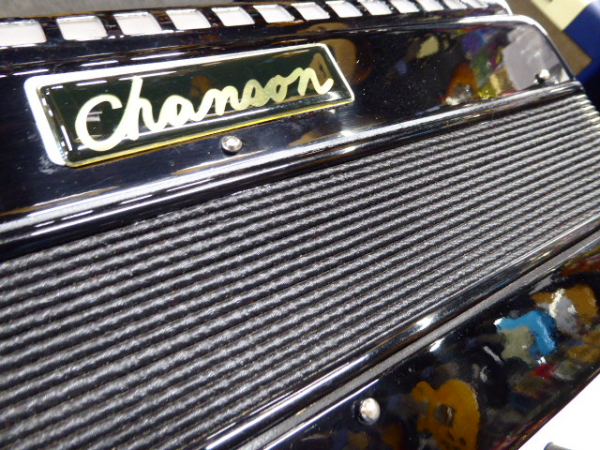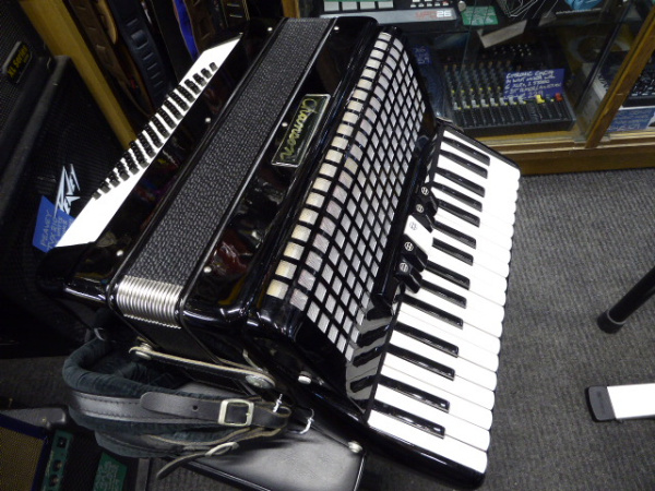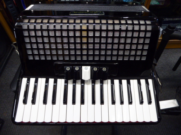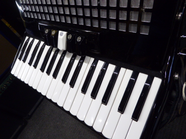 Lovely 72 bass accordion with 34 treble keys, three-voice tremolo tuning and five treble couplers.