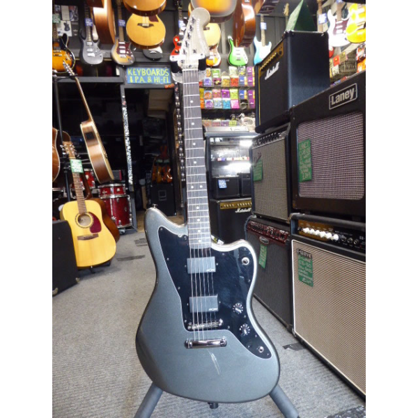 Discontinued Jazzmaster with active circuit, twin humbucking pickups, stoptail bridge, Graphite Metallic finish, and matching headstock.
