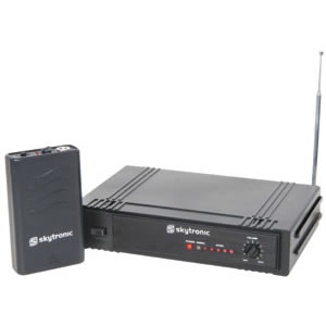 A professional VHF instrument radio system with bodypack transmitter and free-standing receiver.